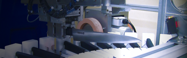 作業員が包丁をターンテーブルにセットして、タッチパネルであらかじめ設定された包丁の種類を選び運転スイッチを押すだけです。